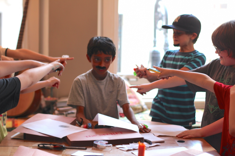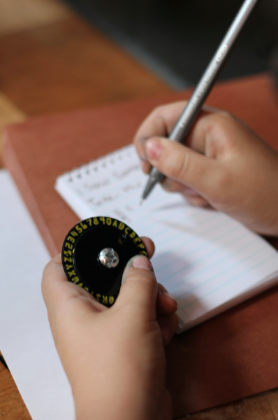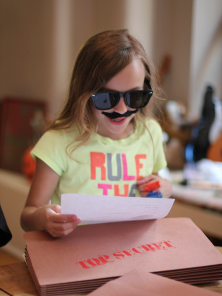 Each kid received a TOP SECRET dossier. In the file was a disguise kit (sunglasses, fake mustaches, Groucho disguise glasses), a notepad & pen, a decoder ring, a magnifying glass and some LED finger flashlights. The file also included a character profile for one suspect in the mystery.