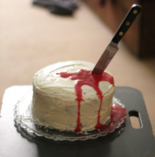 Murder Mystery Cake: We baked a homemade red velvet cake, but you could use any cake, including a store-bought cake. Whip up or buy a little raspberry syrup to make a big blood stain, letting it drip down the sides. Then stick a big ol’ knife in the middle of the “blood.”