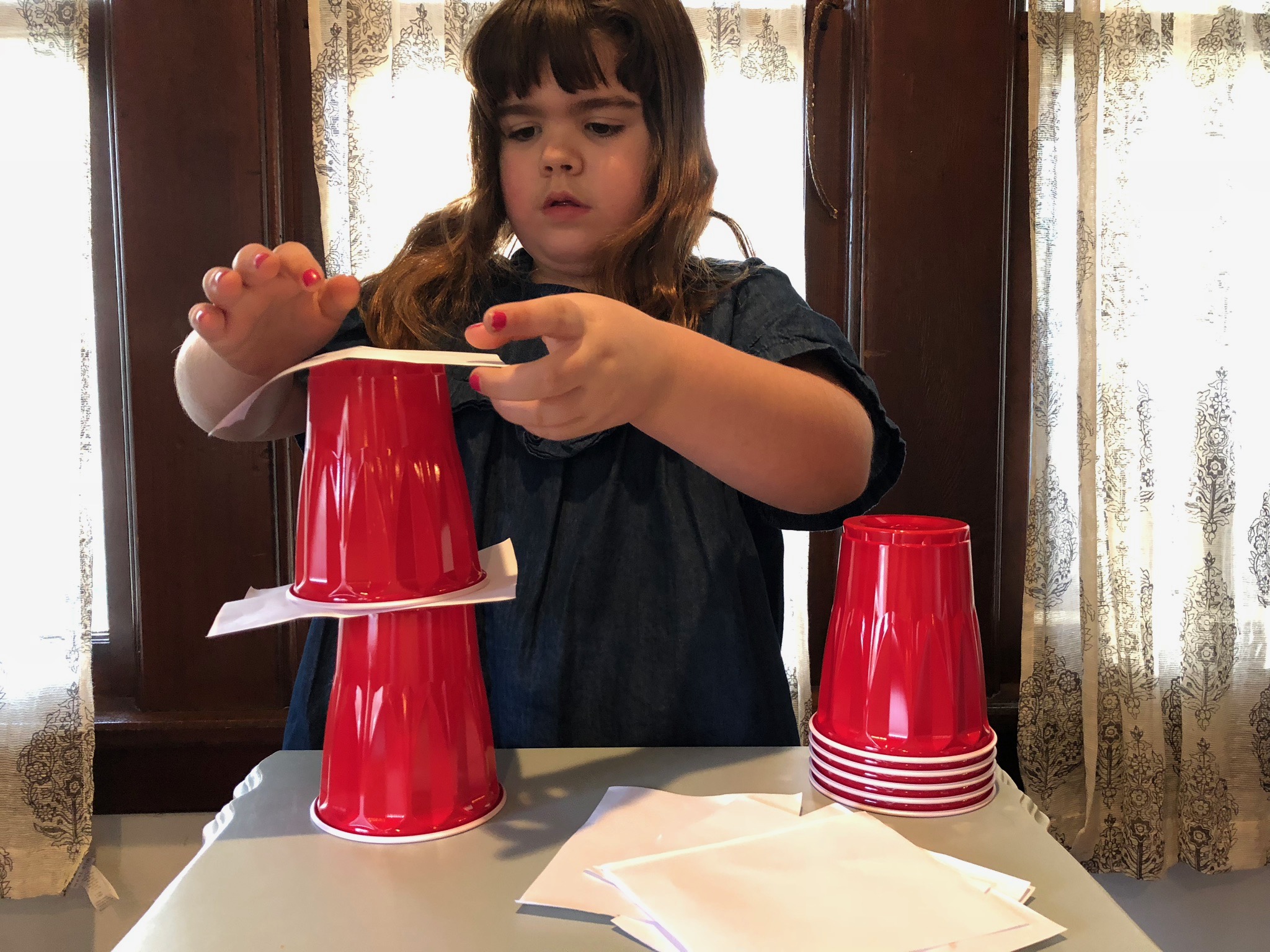 Engineer a tall tower using red party cups and sheets of paper. How high can you go?