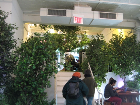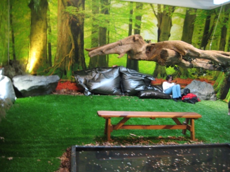 The park is actually three different rooms, the first is the smallest with a bona fide wood picnic table in the corner nestled among the trees and bushes. Downstairs is a large room with skylights in its super high ceiling, another park bench, a lawn for sitting among the trees and a bright pink teeter totter. Off this room is the “back” room, which is the most crowded, but also the most interesting. This room has realistic photo murals on the walls to give the illusion that you are in a forest, a pond (full of coins from wishers), giant rocks and huge black and silver fat boys cushions to lounge on. This room also has a small alcove with a wood chip floor and park bench seating. I saw adults reading, picnicking and chatting as well as a toddler exploring the place.