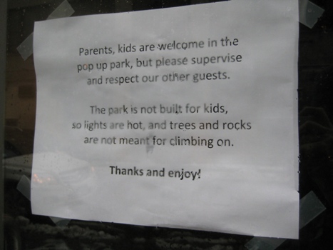 During Tuesday's freezing rain, sleet, snow and ice storm, I left my warm and cozy (well, overheated and small) apartment to check out park here, the indoor temporary pop up park created in a gallery space on Mulberry Street that I have been reading about everywhere. Is it worth dragging the kids out in this weather? Read on to find out.