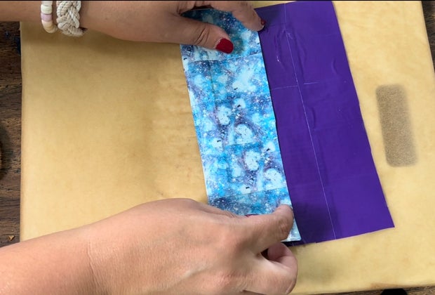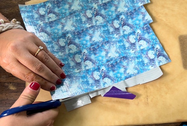 To do this, lay five eight-inch pieces of duct tape on the non-stick surface sticky side up. Then, lay five more eight-inch pieces of duct tape across the sticky side.