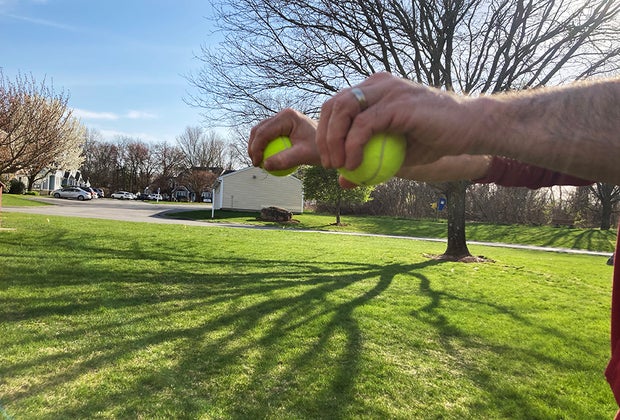 Mom always told me not to throw things in the house. With this exercise, your little aces can work on their throwing motion with a real ball in a confined space. Find a long, sturdy tube sock. Put a baseball (or softball if it will fit!) inside and pull the sock up your child’s throwing arm. Leave a few inches of slack at the bottom of the sock, so the ball can dangle out of your child's hand. Without cutting off circulation, ensure the sock stays in place with a bit of tape. Now they can throw indoors without taking out an heirloom, though it’s probably best to make sure they throw it away from the television just in case the stitching gives out on the sock!