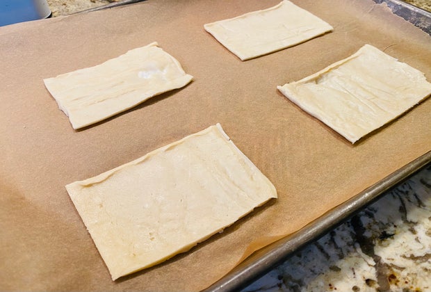 Using a paper cutout rectangle, cut the pie dough into rectangles. You can pull all the dough scraps together and roll the dough out to a ¼ layer and cut out the remaining rectangles. Make sure you have an even amount of rectangles.
