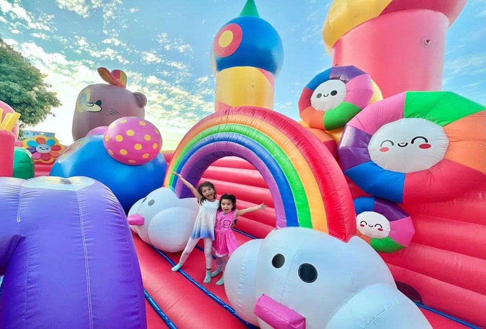 Kids and parents bounce in the Funbox, a huge traveling inflatable experience. Guests purchase tickets online for 90-minute sessions. The bouncy is 25,000 sq. ft. of continuous jumping zones connecting 10 different play areas.