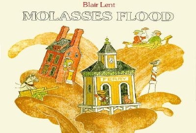 Molasses Flood by Blair Lent introduces young children to one of the more bizarre facts of Boston history: the 1919 Molasses Flood. The flood in this story is much less disastrous than the actual one: no one is killed or injured. Little Charlie Owen Muldoon rides his house like a boat on the tide of molasses calling "The molasses is coming! The molasses is coming!" a la Paul Revere. In the end, the only harm done is that some of the houses end up far from where they started (which the narrator notes is not a big deal since Boston streets were confusing to begin with), and Charley gets tired of eating molasses with every meal after salvaging it from the flooded streets.