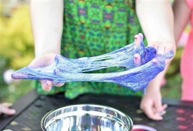 The slime recipe uses non-toxic ingredients, including liquid glue, baking soda, contact solution, food coloring, glitter, and essential oils.