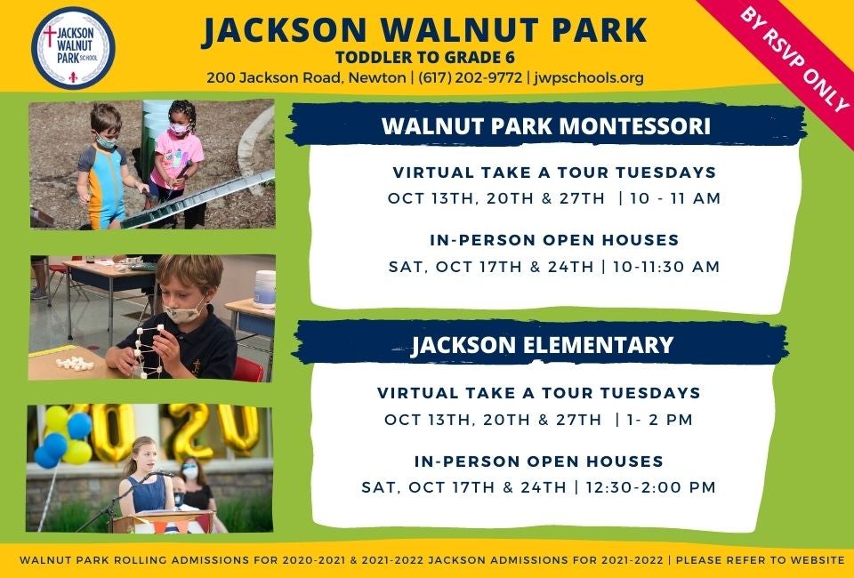 Please join Jackson Walnut Park School in Newton for a virtual Take a Tour Tuesday or the Saturday in-person open houses. Students range from toddler to Grade 6.