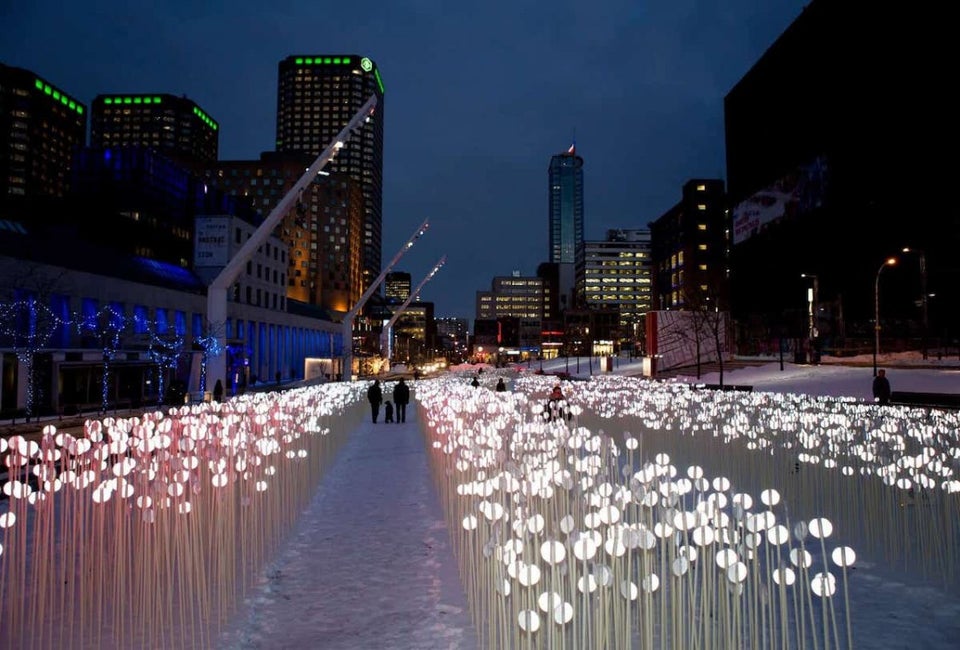 The Seaport has partnered with Canadian art production company Creos and architectural firm KANVA on “Entre les rangs,” a twinkling collection of 28,000 handmade white crystalline stems topped with white reflectors that are displayed on Seaport Common.