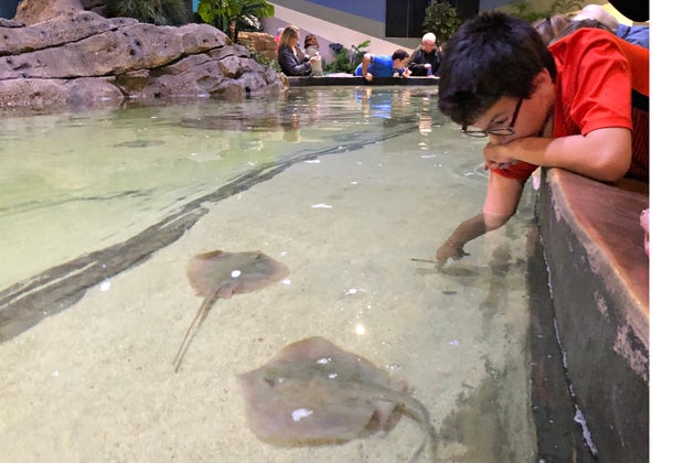 Children can touch gentle hermit crabs, sharks, and stingrays.