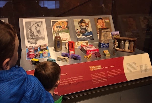 The next section of the exhibit—which showed how the Mayans and Aztecs figured out how to transform the bitter seeds into a rich drink and developed it as important currency with Europe— was most fascinating to me...which means, of course, that it was a little over my little kids' heads. They started to get excited again in the next section, as soon as they saw evidence of sugar entering the historical picture. There's a beautiful display of porcelain that wealthy Europeans used to serve their heavily sweetened new import. Even more enjoyable to them was around the next turn, when the curators smartly added a little bright color—in the form of American candy wrappers, ads, and such—into what was, before that, a pretty beige exhibit. On the day we were there, a museum staffer was situated at a table, where she was explaining to small groups how cocoa powder is liquified, tempered, and eventually molded into a chocolate bar—an informal talk that fascinated my 5-year-old, in particular.