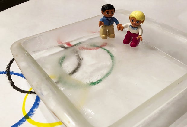 6. A couple of days before the party, help your kids make miniature Olympic competition venues. We made a ski slope, a skeleton run, and an ice rink. For tutorials, take a look at the mini ski slope and mini ice rink from Toddler Approved. When it’s party time, pull out the little plastic people your kids have stashed all over the house and use them as tiny athletes who are competing. Glide them on the mini ice rink or tape on some popsicle-stick skis and race them down the mini ski slope (my son also put his Playmobil people in milk bottle caps for a tubing race).