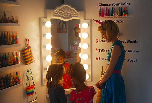 The shop is about more than fashion and party accessories, though. Kids can use a handheld black light to uncover secret messages on the walls. When my 4-year-old daughter and her 5-year-old friend did it, they found “I can do anything” under a row of unicorn horns. There's also "Do the impossible," and other empowering phrases.
