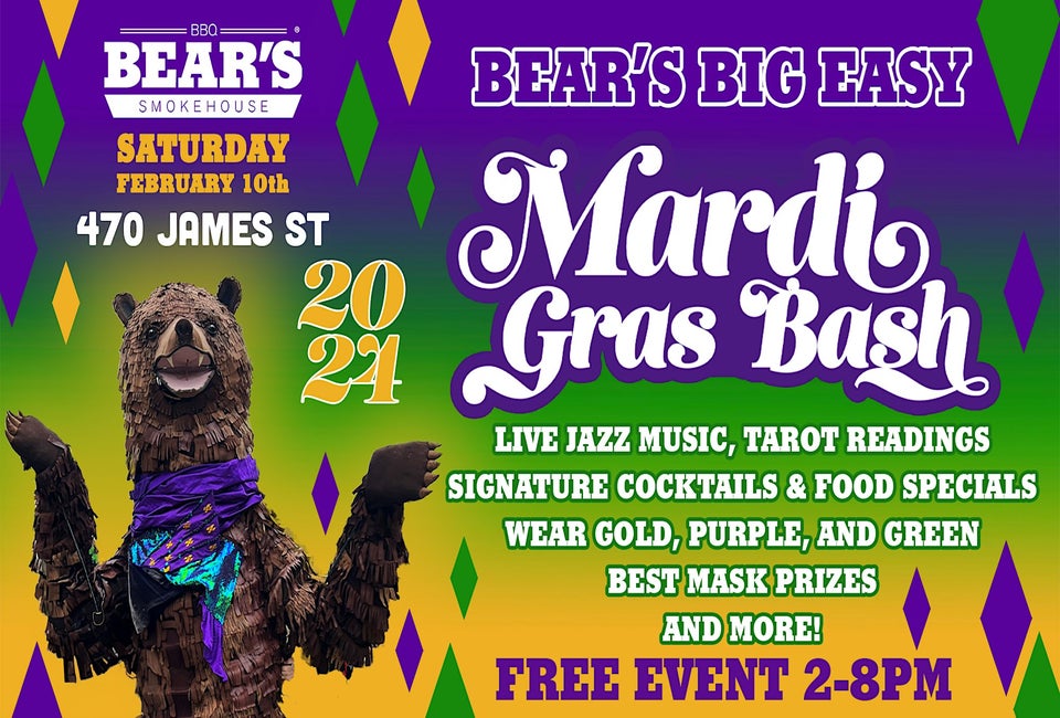 FREE family friendly Mardi Gras celebration at Bear's. There will be food and drink specials, a kid zone with activities, live music.