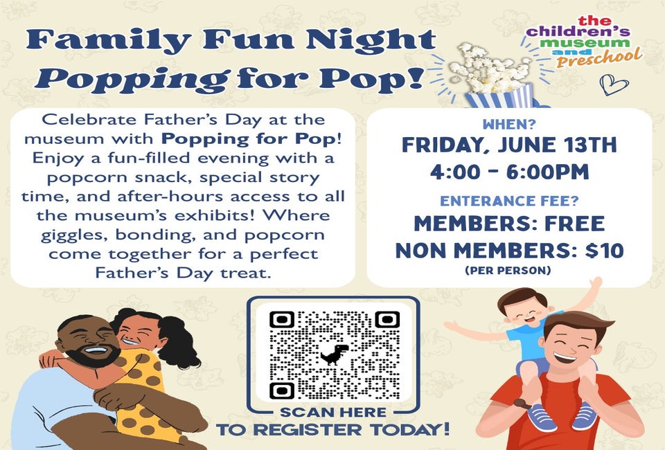 Kick Off Father’s Day Weekend with us! Make the whole weekend all about Dad—starting with our Family Fun Night: Popping for Pop at the museum. It's a special evening packed with popcorn snacks, story time, and exclusive after-hours access to all our exhibits.