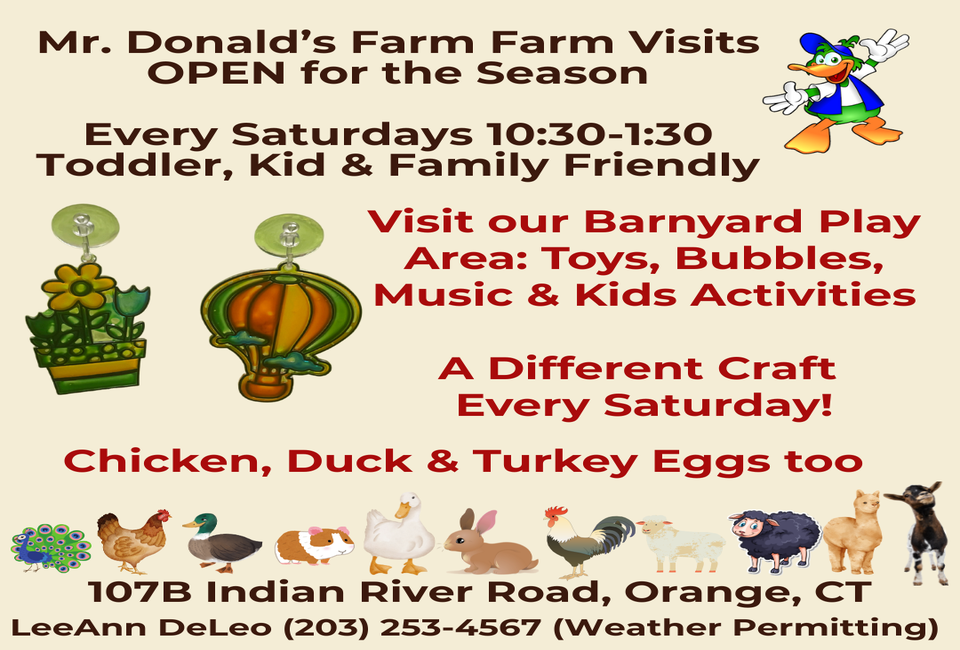 .Follow us on FB @MrDonaldsFarm Call LeeAnn for more info: (203) 253-4567 or if unsure of weather conditions. (Groups/weekday visits by appointment)
