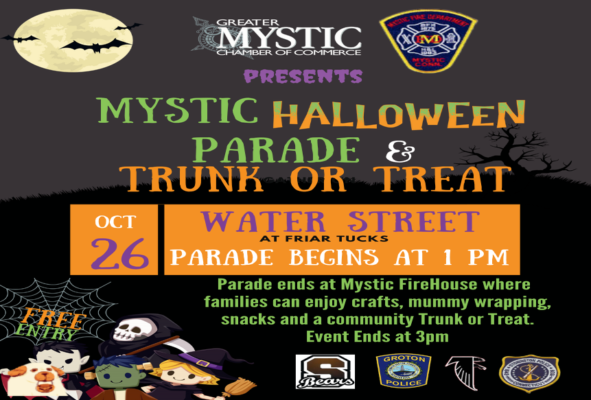 The Annual Halloween Parade & Trunk-or-Treat is back this year in Downtown Mystic! Join the Mystic Fire Department, Stonington Police Department, Groton Town Police, Stonington High School and the Greater Mystic Chamber of Commerce on Sunday, October 26th for a spooktacular Halloween event.