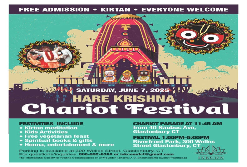 Join the 2025 Hare Krishna Chariot Festival in Glastonbury. The festival begins with a colorful chariot parade along Naubuc Avenue, ending in Riverfront Park at 300 Welles Street. Enjoy a free vegetarian meal of delicious Indian-style cuisine and drink.