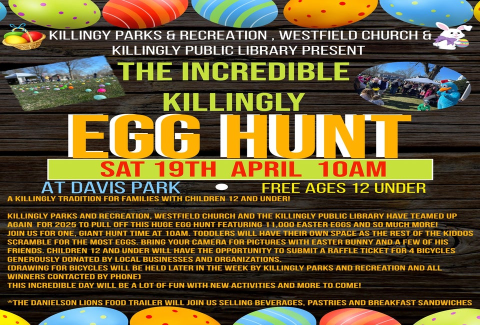 Join Killingly again for one, GIANT hunt time at 10am. Toddlers will have their own space as the rest of the kiddos scramble for the most eggs. Pictures with Easter Bunny, fun activities and more to come!