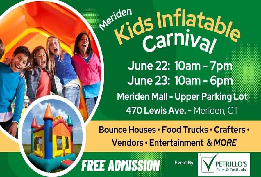 Join us at Meriden Kids Inflatable Carnival in the upper parking lot of Meriden Mall. The carnival will frature 8 inflatables, 12 food trucks, 30 outside vendors, and 35 indoor vendors.