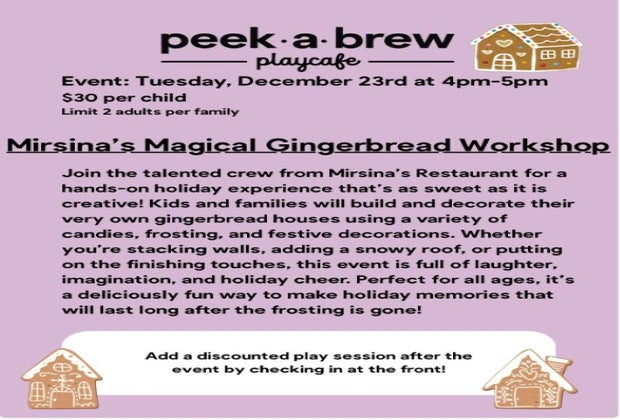 Join the crew from Mirsina’s Restaurant for a hands-on holiday experience that’s as sweet as it is creative! Kids and families will build and decorate their very own gingerbread houses using a variety of candies, frosting, and festive decorations.