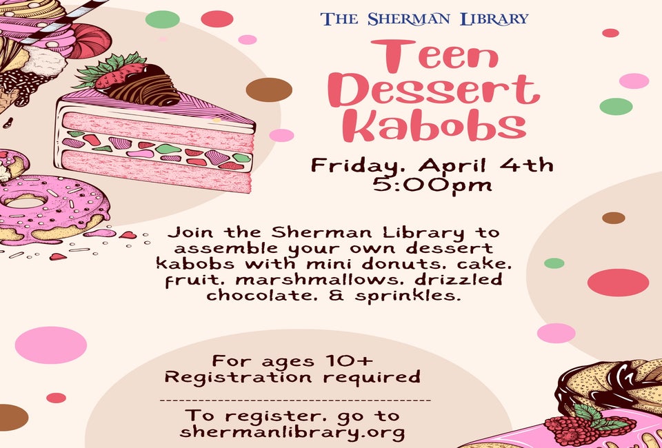 Kids 10+ years of age are welcome to gather at the Sherman Library to assemble their own dessert kabobs with mini donuts, cake, fruit, marshmallows, drizzled chocolate, and sprinkles.