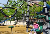 We posted about this glorious playground a few years back. In the summer, the main attraction is the water, which seems to spew from all over the place. But even though the sprinklers weren't yet turned on when we visited, it was still our favorite playground in the neighborhood. The whimsical space is very inviting, filled with colorful equipment and shady spots to sit. There's a segregated toddler area with a small sandbox. Older kids will have a blast digging in the huge sandbox and playing on the unique climbing structures, which include spinning action and a mini rock wall. The only way I got my daughter to leave was by telling her there was a carousel to visit nearby.