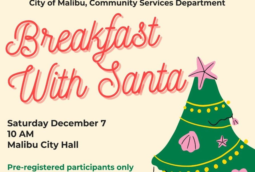 The morning includes art activities, storytime with the Malibu Library, and photos with Surfing Santa and Mrs. Claus.