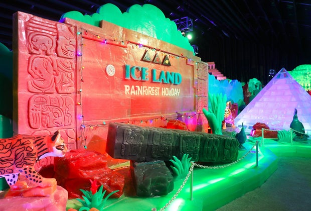 Ice Land is an indoor walk-through experience carved entirely out of ice by master carvers. To keep the ice frozen, the space is kept at 9 degrees. Moody Gardens provides parkas to keep guests warm as they explore Ice Land. The hand-sculpted creations guide guests on a journey through the world's rainforests, complete with a giant ice slide. For the adults, Shivers Ice Bar inside of Ice Land features festive holiday spirits, and if you need to warm up after the experience hot cocoa and other treats are available for purchase in the gift shop at the exit.