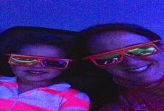 When we got to the movie, we waited in a pre-show area where a short preview played on a television. It was really cool and got us even more excited. As we walked in, we were each handed 3D glasses (a toddler delight) and got to pick anywhere we wanted to sit in a small theater. There was trivia playing up on the screen while we waited for the movie to start, and we had a fun time trying to answer the questions.