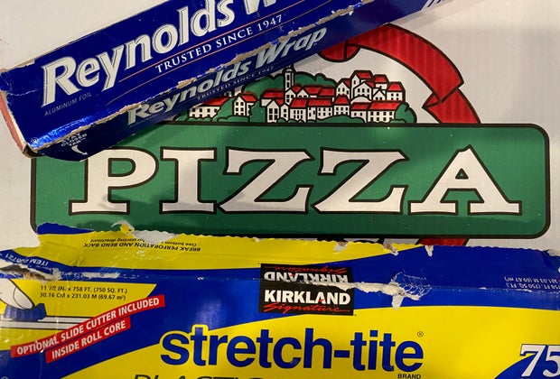 Cover the inside of the pizza box with aluminum foil.