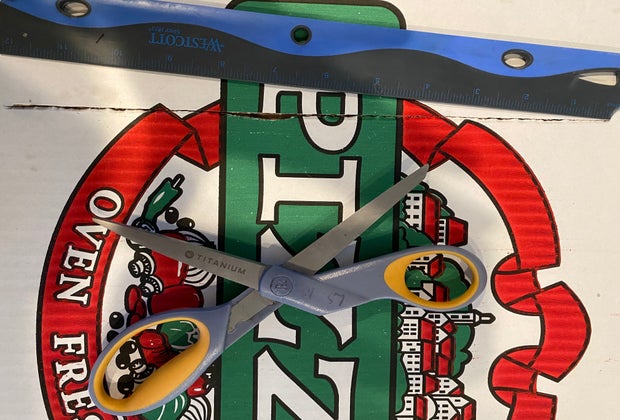 Measure 1 inch from the front and sides of your pizza box, and cut the three sides to create a flap in your pizza oven; do not cut along the back. Once you have cut the three sides, gently bend the pizza box to create a flap and a window at the top of the box.