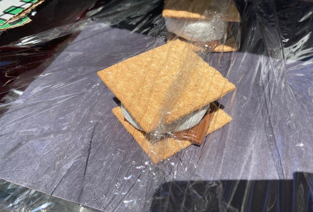 We placed “raw” s’mores on the black construction paper and let them sit in the sun for a little bit. The tinfoil flap reflects the sun's rays into the pizza box. The plastic wrap window works like a greenhouse and traps the heat. You can tweak your solar oven to perfect it and make it even better. Experiment by changing the angle of the flap, or trying different ingredients to see what cooks fastest. What else you can cook? Cookies, popcorn, and grilled cheese are great places to start. Once you get the swing of things, you can make fresh nachos, English muffin pizzas, or even quesadillas!