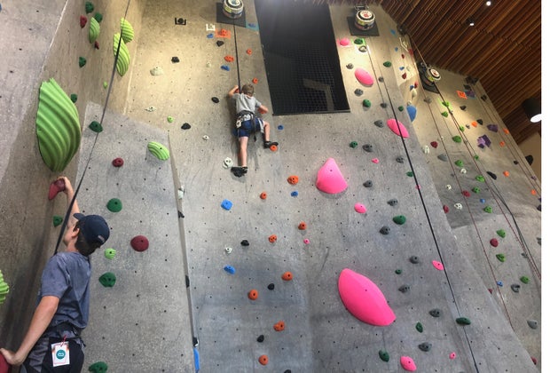 Instructors help counsel kids on the wall at the Stowe Rocks Climbing Center.