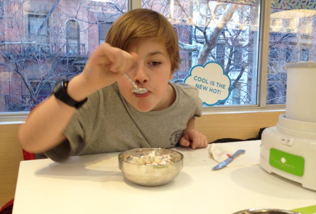 My 10-year-old son and I checked out CoolMess, excited by the idea of a bona fide ice cream parlor not far from home. Knowing it offered customized ice cream creations, we were expecting a server to paddle together ice cream and mix-ins on a slab counterside. How pleasantly surprised we were to discover we were wrong. At CoolMess, the customer does all the work, if you can call making ice cream work.