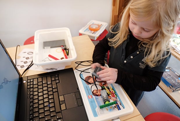 Top image: A young girl builds an airplane with Lego WeDo. Simple block programming will help her to create a propeller that spins. Photo courtesy of Geek Forest.