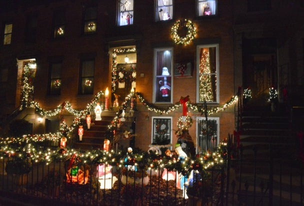 The light displays at these adjoining brownstones look like they belong in Dyker Heights. Every inch of the facade and front yard has been wrapped and decorated. Christmas music plays all day.