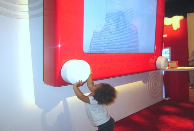 The giant Etch A Sketch snaps a family photo and turns it into a doodle.