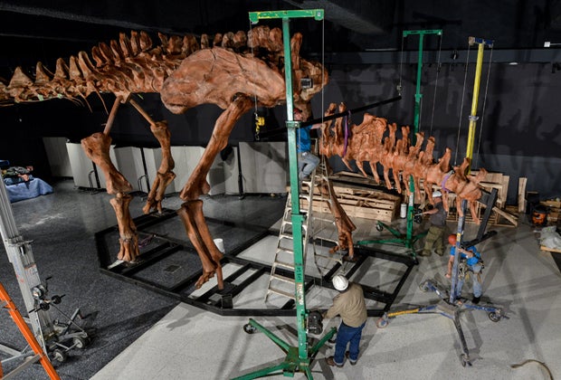 It took 18 months and heavy machinery like bulldozers to fully dig out the skeleton, according to Diego Pol, a paleontologist from Museo Paleontológico Egidio Feruglio who co-led the excavation team. Spread over seven expeditions, each involving teams of 25 people, digging was limited to spring and summer months as winter conditions in Argentina's Patagonia were too harsh for archeological digs, he explained during a press event for the unveiling. Pol and his team came upon the bones in 2012 after a rancher stopped by the museum to tell staff about fossils on his land.