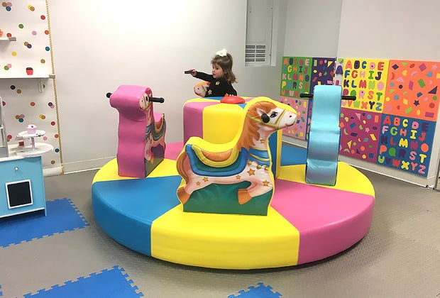 Children giggle and laugh as they bounce on the trampoline, race down the double slide and dizzy themselves on the rotating swing. But the kids’ favorite activity is to ride the colorful, cushioned carousel. The wall-to-wall soft foam floor mats make crawling and playing safe and comfortable for even the most unsteady toddlers. Caregivers can sip their coffee carefree while keeping an eye on their children the whole time. There are also staff attendants in the play area helping to keep the kids safe and engaged.