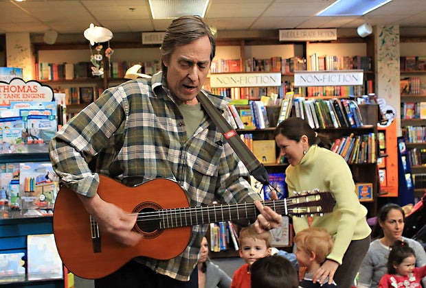 Guitarist Jeff Sorg adds a musical touch to storytime with singing and dancing for children and families at Book Revue in Huntington. Photo by AnnaLee Barclay