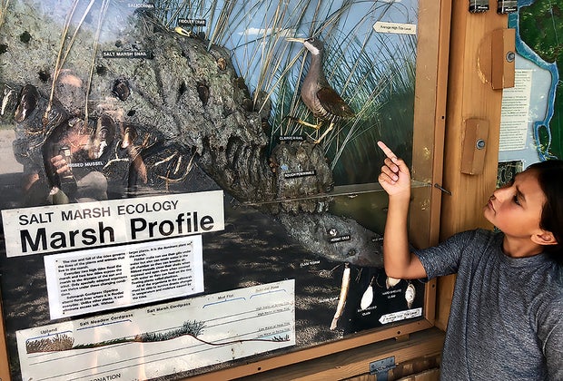 Rest at any of the eight designated observation and study sites that offer teachable moments in this "outdoor classroom." Stay on the trails: Slippery rocks, steep hills, etc. are unsafe terrain for little feet. And keep your eyes peeled—both up and down. Babbling water below is home to fish and crabs, while the skies above belong to the birds. On our walk we met a friendly egret named "Earl," who let us pass the bridge ever-so-closely. We later learned he was looking for a handout.
