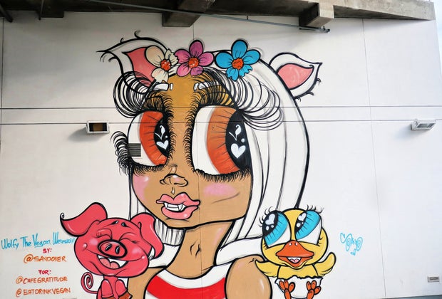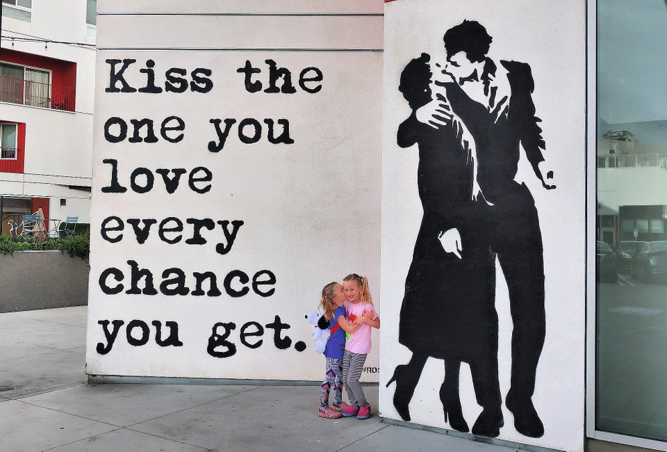 This Arts District apartment and shopping complex (300 S. Santa Fe Ave.) is a one-stop shop for seeing some awesome street art. That includes "Untitled" by Ruben Rojas, which is a wall full of the word 'love' written in rainbow-hued cursive, and Sand's "Wolfy the Vegan Werewolf," which is a cute, cartoon-style lady posing with animals. Our favorite at the complex, though, is definitely "Kiss" by WRDSMTH. The message may strike an especially poignant tone in challenging times: "Kiss the one you love every chance you get."