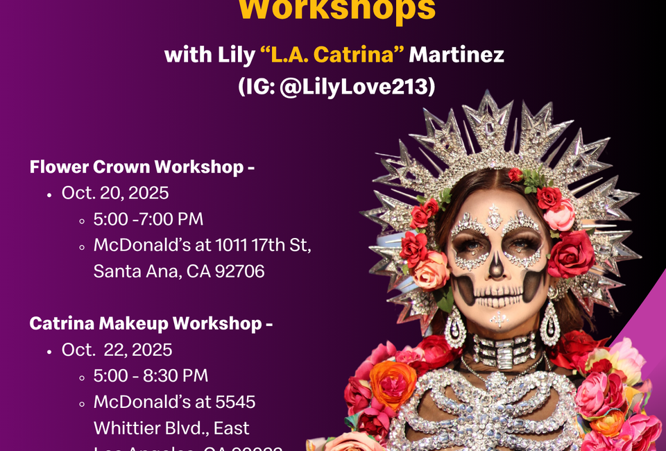 Two free workshops are held: a Flower Crown Workshop in Santa Ana on Monday Oct. 20 and a Catrina Makeup Workshop in East Los Angeles on Wednesday, Oct. 22.