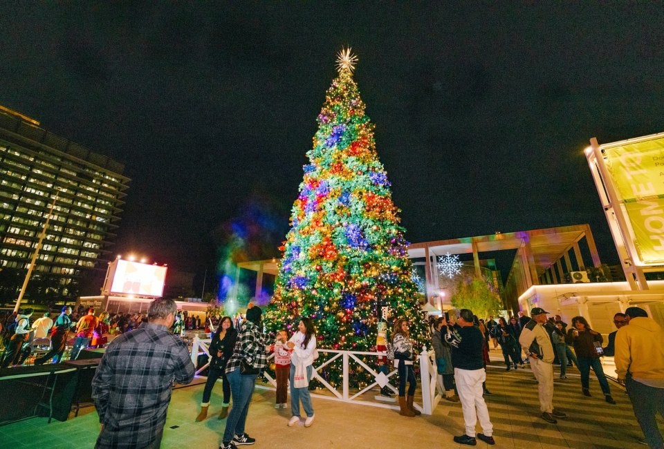 A majestic tree is the centerpiece of LA County's annual tree lighting ceremony, held on the Music Center's Jerry Moss Plaza.