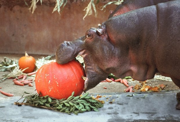 Let the record show that there is more than one way to smash a pumpkin, and handing it to a hippo is definitely one of them. A gorilla does the job pretty well, too, as does a tiger, or—well, just about any other animal at the zoo. This discovery by our nation's zookeepers has led to a peculiar Halloween tradition—that we highly recommend!