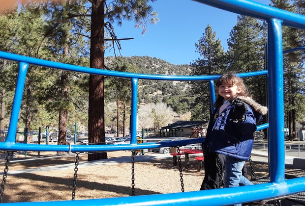 We love to visit Wrightwood when there's snow, and we found just the perfect place where you can go play with lots of it, and for free. For small children, I recommend the Apple Tree Campground. It has well-groomed small slopes and open spaces—and the great thing is you can also bring your own sleds. Remember to buy the Adventure Passes for parking, which you can buy at the Mountain Hardware Store, at the Grassy Hollow Visitor Center, Jensen, and Wrightwood Mini Mart.