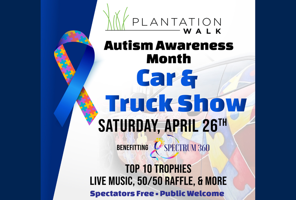 Join Plantation Walk for the inaugural Autism Awareness Car & Truck Show, supporting Autism Awareness Month and benefitting Spectrum 360.