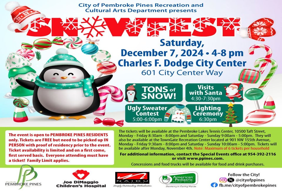 For Pembroke Pines residents only. Santa and his friends invite you to come play in tons of snow and slide down the 10-ft tall dual slides. Enjoy the sounds of the holidays with over 400 singers and dancers on the holiday stage. Visit the different themed areas for family holiday photo opportunities with Santa, Mrs. Claus, and some friendly North Pole friends and elves.
