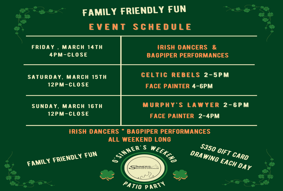 It’s that time of year again for Sinner's Seafood & Steakhouse's O’Sinner’s St. Patrick’s Day weekend, featuring authentic Irish fare and live music, face painting, drink specials, games, prizes, and huge giveaways.